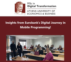 Στις 24 Φεβρουαρίου 2025, στο μάθημα "Mobile Programming" του ΠΜΣ «Ψηφιακός Μετασχηματισμός» του ΟΠΑ, είχαμε την τιμή να φιλοξενήσουμε την κυρία Χριστίνα Αποστόλου, Διευθύντρια Κινητής Τραπεζικής της Eurobank. Κατά τη διάρκεια της εμπεριστατωμένης παρουσίασής της, η κυρία Αποστόλου μοιράστηκε μαζί μας την απίστευτη ψηφιακή πορεία της Eurobank, ξεκινώντας από τις πρώτες της ψηφιακές υπηρεσίες και φτάνοντας στην κορυφαία σημερινή εφαρμογή κινητής τραπεζικής. Η κυρία Αποστόλου αναφέρθηκε στις agile μεθόδους που χρησιμοποιήθηκαν για τον επανασχεδιασμό της εφαρμογής, δίνοντας έμφαση στη σημασία της ανατροφοδότησης των χρηστών για τη διαμόρφωση του τελικού προϊόντος. Η προσοχή επικεντρώθηκε στη βελτίωση της χρηστικότητας, της λειτουργικότητας και στη δημιουργία ενός σύγχρονου σχεδιασμού. Η παρουσίαση περιλάμβανε επίσης την τελευταία έκδοση της εφαρμογής κινητής τραπεζικής της Eurobank, τονίζοντας τα νέα χαρακτηριστικά και τον κομψό, φιλικό προς τον χρήστη σχεδιασμό που την ξεχωρίζει στον κόσμο της κινητής τραπεζικής. Ένα μεγάλο ευχαριστώ στην κυρία Χριστίνα Αποστόλου και την Eurobank για τη διάθεση των γνώσεων και των εμπειριών τους. Ευχαριστούμε επίσης τον Δρα. Ιωάννη Κοντόπουλο, διδάσκοντα του μαθήματος, για την οργάνωση αυτής της πολύτιμης συνεδρίας και για τη συνεχιζόμενη καθοδήγησή του στον συναρπαστικό κόσμο του προγραμματισμού κινητών. Είμαστε ενθουσιασμένοι που συνεχίζουμε να μαθαίνουμε για το συνεχώς εξελισσόμενο πεδίο της ανάπτυξης κινητών εφαρμογών!