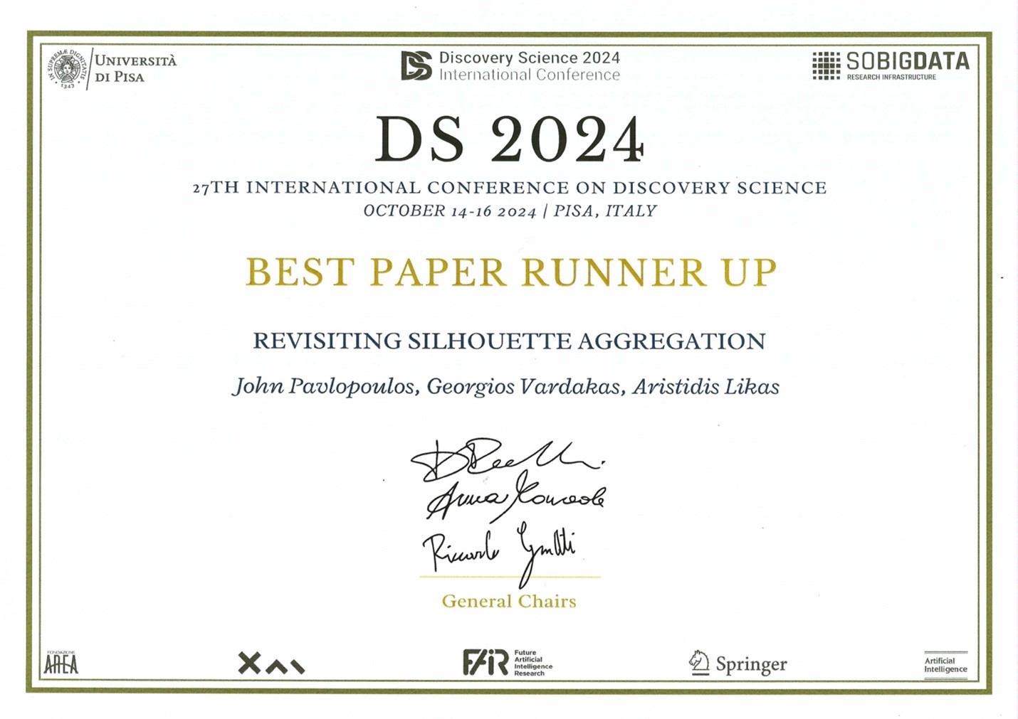 Η πρόσφατη έρευνα του Επίκουρου Καθηγητή Γιάννη Παυλόπουλου, «Revisiting Silhouette Aggregation», αναγνωρίστηκε ως Best Paper Runner Up στο συνέδριο Discovery Science 2024 στην Πίζα. Σε συνεργασία με τους Αριστείδη Λύκα και Γιώργο Βαρδάκα από το Τμήμα Μηχανικών Η/Υ και Πληροφορικής στο Πανεπιστήμιο Ιωαννίνων, ο Δρ. Παυλόπουλος ανέδειξε μια ισχυρή αλλά παραμελημένη μέθοδο αξιολόγησης λύσεων συσταδοποίησης (clustering) μέσω του δείκτη Silhouette, η οποία προσφέρει ιδιαίτερα πλεονεκτήματα για σύνολα δεδομένων με ανισοπληθείς συστάδες (cluster imbalance). Η εργασία τους εισάγει επίσης μια νέα τεχνική δειγματοληψίας, η οποία είναι σημαντική για μεγάλα σύνολα δεδομένων, ενισχύοντας την αξιοπιστία και τη σταθερότητα στην ανάλυση συσταδοποίησης.