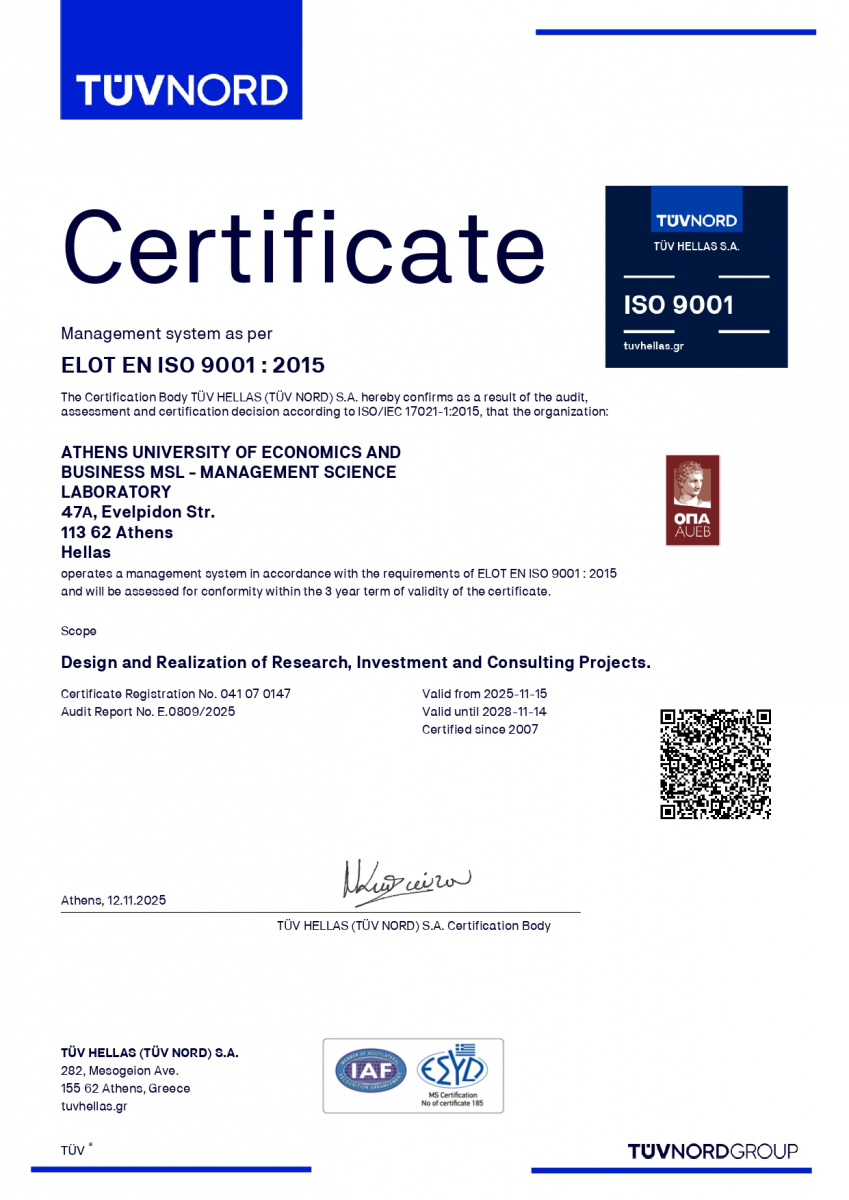 Το Εργαστήριο Διοικητικής Επιστήμης (MSL – Management Science Laboratory) του Τμήματος Διοικητικής Επιστήμης και Τεχνολογίας (ΔΕΤ), της Σχολής Διοίκησης Επιχειρήσεων, του Οικονομικού Πανεπιστημίου Αθηνών (ΟΠΑ), ανανέωσε την πιστοποίησή του κατά ISO 9001:2015, από τον φορέα επιθεώρησης, πιστοποίησης και εκπαίδευσης, TÜV NORD Hellas S.A., έως τον Νοέμβριο του 2028.