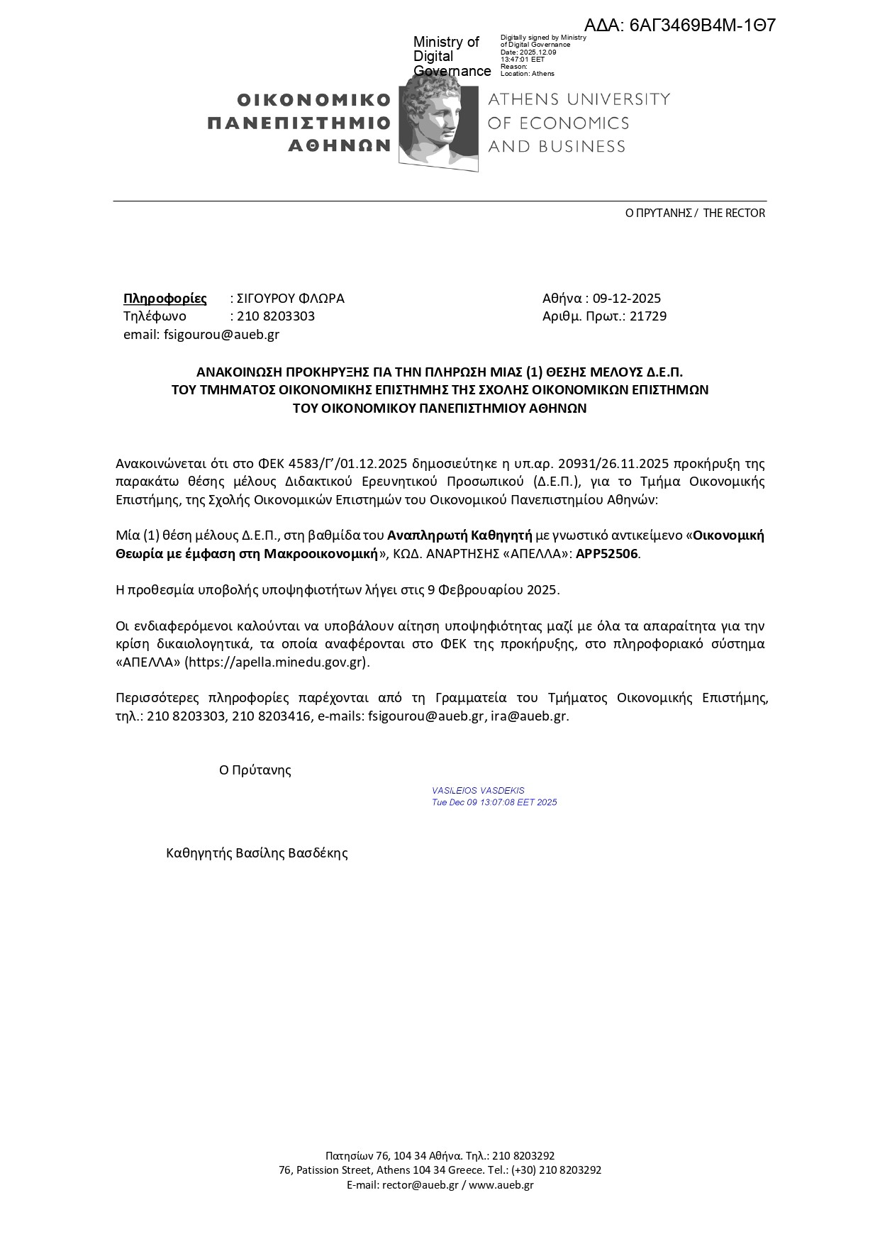 Προκήρυξη για την Πλήρωση Μίας Θέσης μέλους Δ.Ε.Π., στη Βαθμίδα του Αναπληρωτή Καθηγητή με Γνωστικό Αντικείμενο «Οικονομική Θεωρία με Έμφαση στη Μακροοικονομική»