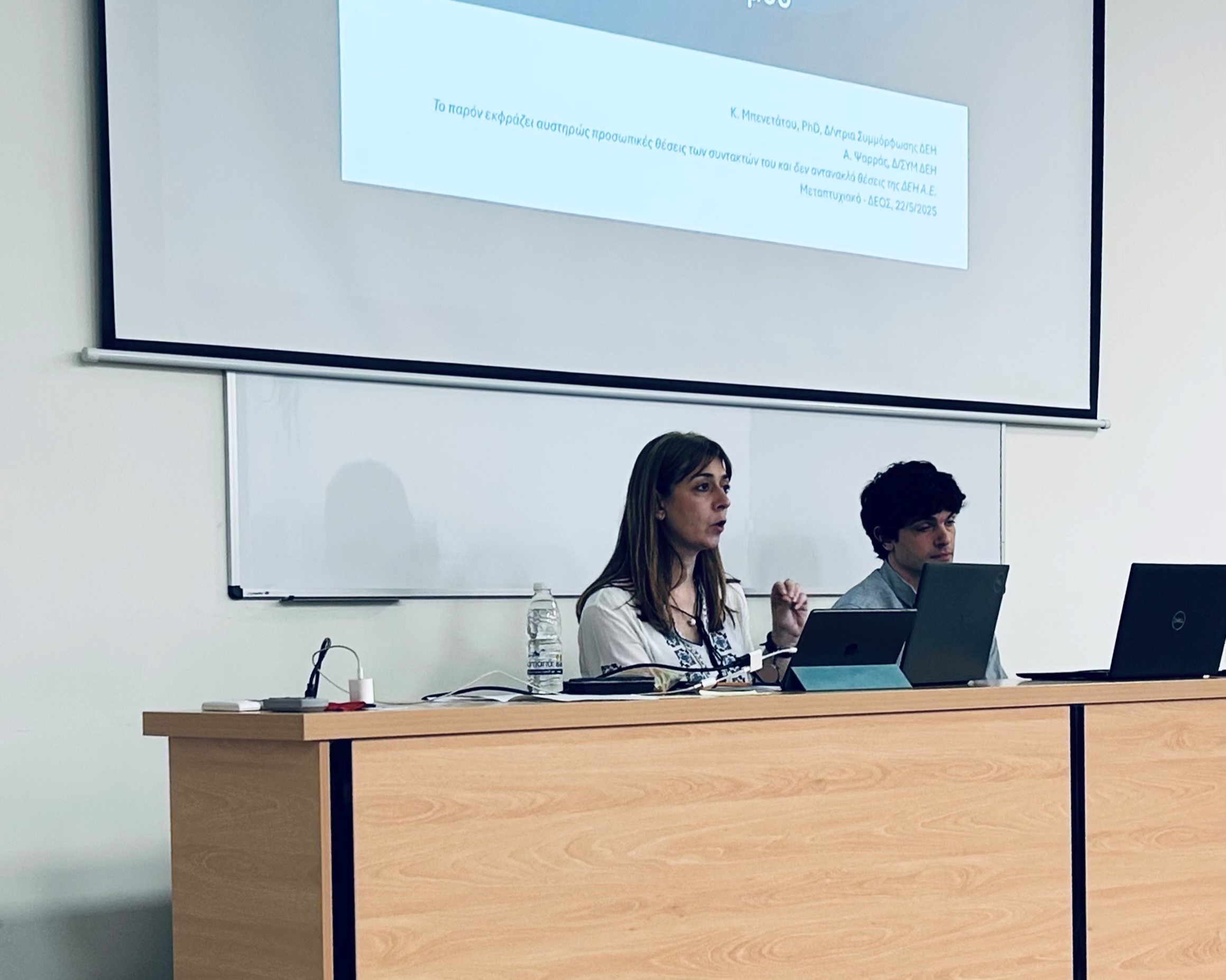 Είχαμε πρόσφατα τη χαρά και την τιμή να φιλοξενήσουμε την κα. Κέλλυ Μπενετάτου, Διευθύντρια Συμμόρφωσης στη ΔΕΗ, και τον συνεργάτη της κ. Άρη Ψαρρά, στο πλαίσιο των μαθημάτων "Ρυθμιστικές Πολιτικές της Ε.Ε." με διδάσκουσα την κα. Χρυσοβαλλάντου Μήλλιου και "Σχεδιασμός και Οικονομική Ρύθμιση Ενεργειακών Αγορών" με διδάσκοντα τον κ. Λάμπρο Πεχλιβανό.