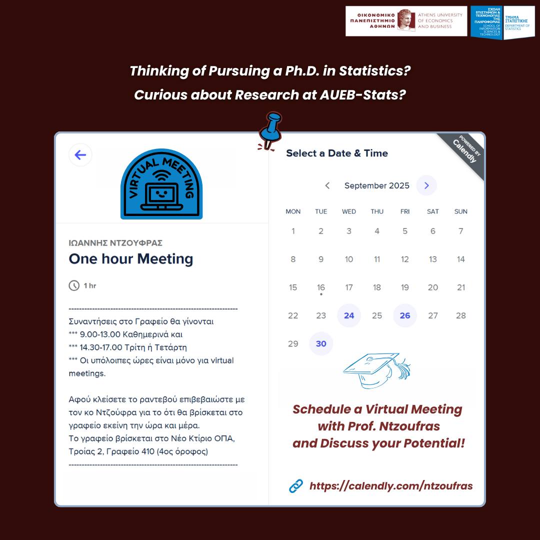 Κλείστε τώρα μία virtual συνάντηση για ενημέρωση, σχετικά με τις Διδακτορικές Σπουδές Στατιστικής στο ΟΠΑ, αλλά και τους πιθανούς τρόπους χρηματοδότησής τους, με τον Ioannis Ntzoufras (Deputy Head, AUEB-Stats: Τμήμα Στατιστικής Οικονομικού Πανεπιστημίου Αθηνών):