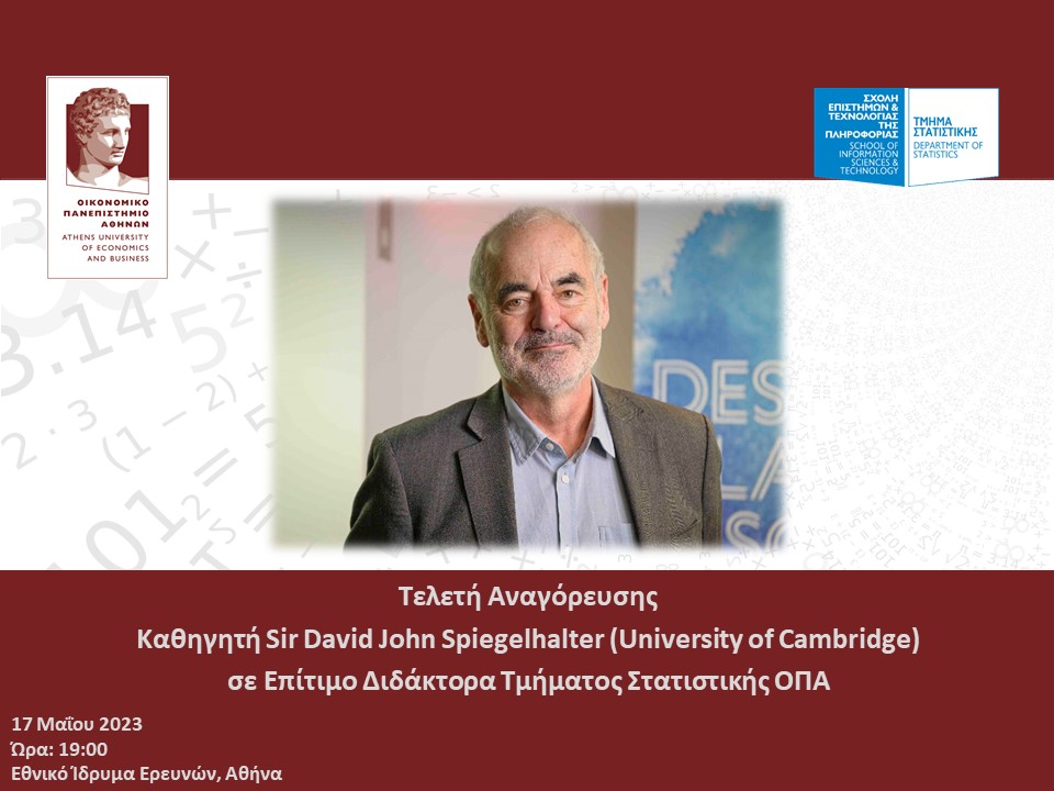 Στις 17 Μαίου 2023, θα πραγματοποιηθεί η Τελετή Αναγόρευσης, σε Επίτιμο Διδάκτορα του Τμήματος Στατιστικής, της Σχολής Επιστημών και Τεχνολογίας της Πληροφορίας, του Οικονομικού Πανεπιστημίου Αθηνών, του Καθηγητή του University of Cambridge, Ηνωμένου Βασιλείου, Sir David John Spiegelhalter. Ο Τιμώμενος θα παραχωρήσει και Ομιλία, με θέμα: "Why the study of statistics and data science is so vital for the future".
