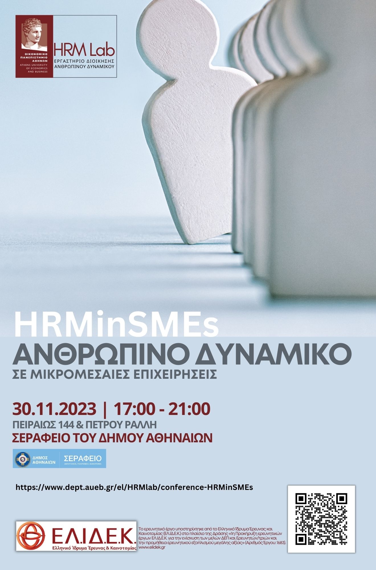 Καλωσήρθατε στη σελίδα του Συνεδρίου "Ανθρώπινο Δυναμικό στις Μικρομεσαίες Επιχειρήσεις-HRMinSMEs" που διοργανώθηκε από το Εργαστήριο Διοίκησης Ανθρώπινου Δυναμικού του Οικονομικού Πανεπιστημίου Αθηνών, με τη χρηματοδότηση του Ελληνικού Ιδρύματος Έρευνας και Καινοτομίας (ΕΛΙΔΕΚ).
