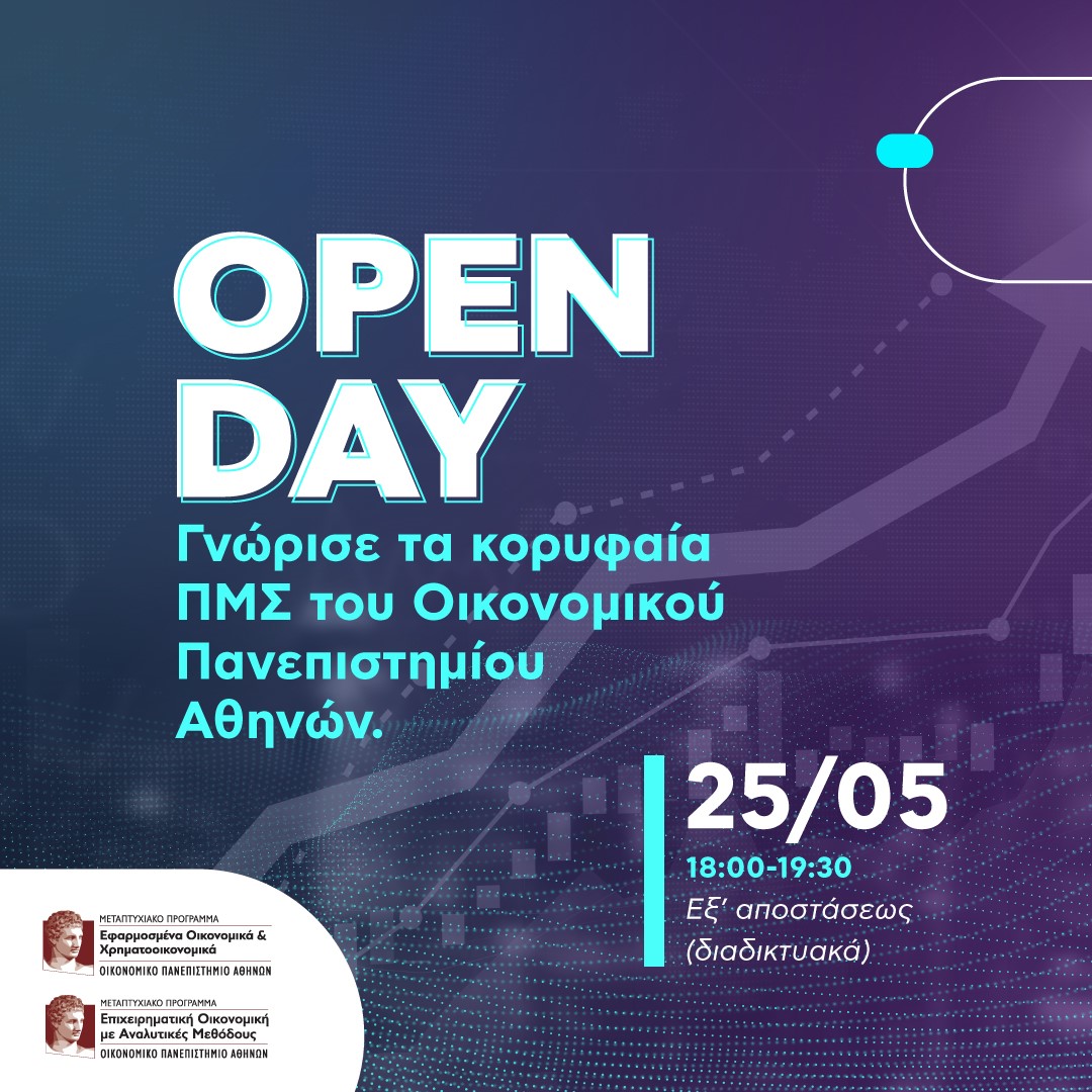 Παρουσίαση των Μεταπτυχιακών Προγραμμάτων "Εφαρμοσμένα Οικονομικά και Χρηματοοικονομικά" & "Επιχειρηματική Οικονομική με Αναλυτικές Μεθόδους" του Τμήματος Οικονομικής Επιστήμης του ΟΠΑ, την Πέμπτη 25 Μαΐου 2023, από τις 18:00 μέχρι τις 19:30.