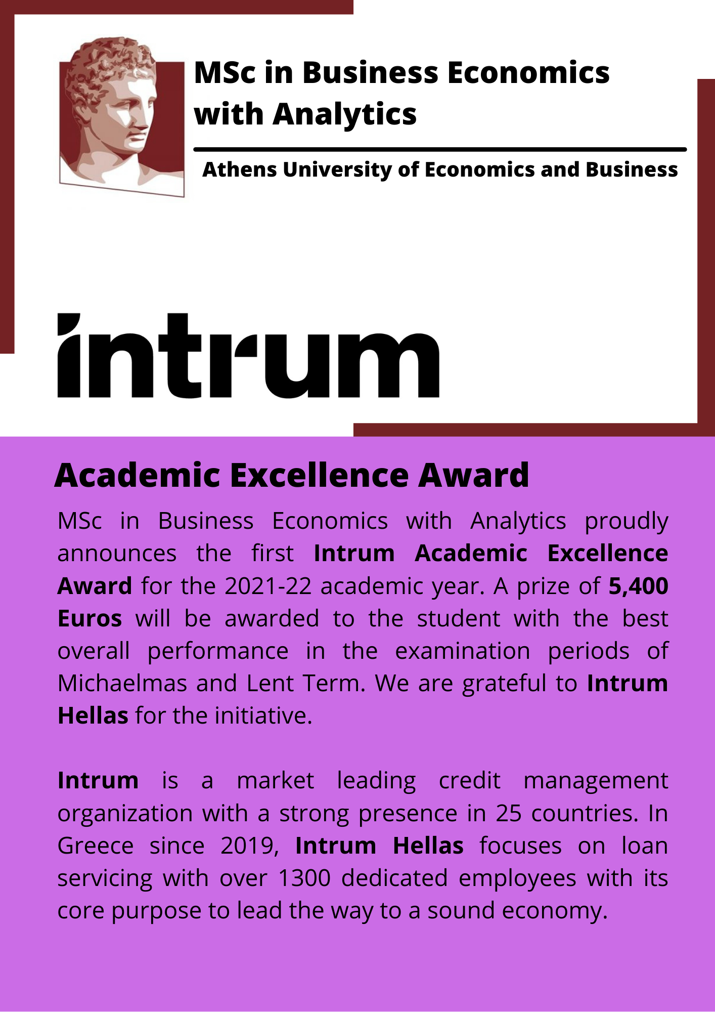MSc in Business Economics with Analytics proudly announces the first Intrum Academic Excellence Award for the 2021-22 academic year. A prize of 5,400 Euros will be awarded to the student with the best overall performance during the Michaelmas and Lent Term examination period. We are grateful to Intrum Hellas for the initiative. Intrum is a market leading credit management organization with a strong presence in 25 countries. In Greece since 2019, Intrum Hellas focuses on loan servicing with over 1300 dedicated employees with its core purpose to lead the way to a sound economy. |