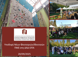 Στις 8 Σεπτεμβρίου 2025 πραγματοποιήθηκε με επιτυχία το καλωσόρισμα της νέας σειράς φοιτητών του ΠΜΣ στη Διοικητική Επιστήμη και Τεχνολογία. Τις/τους φοιτήτριες/φοιτητές καλωσόρισαν ο Διευθυντής του Μεταπτυχιακού, Καθηγητής Γεώργιος Λεκάκος, ενώ χαιρετισμό απηύθυναν η Κοσμήτορας του ΟΠΑ, Καθηγήτρια Αγγελική Πουλυμενάκου, ο Πρόεδρος του Τμήματος ΔΕΤ, Καθηγητής Ιωάννης Νικολάου καθώς και εκπρόσωπος της εταιρείας doValue, ο οποίος τόνισε την εξαιρετική συνεργασία των επιχειρήσεων με το Μεταπτυχιακό και τις προοπτικές καριέρας που δημιουργεί για τις/τους απόφοιτές/αποφοίτους του.