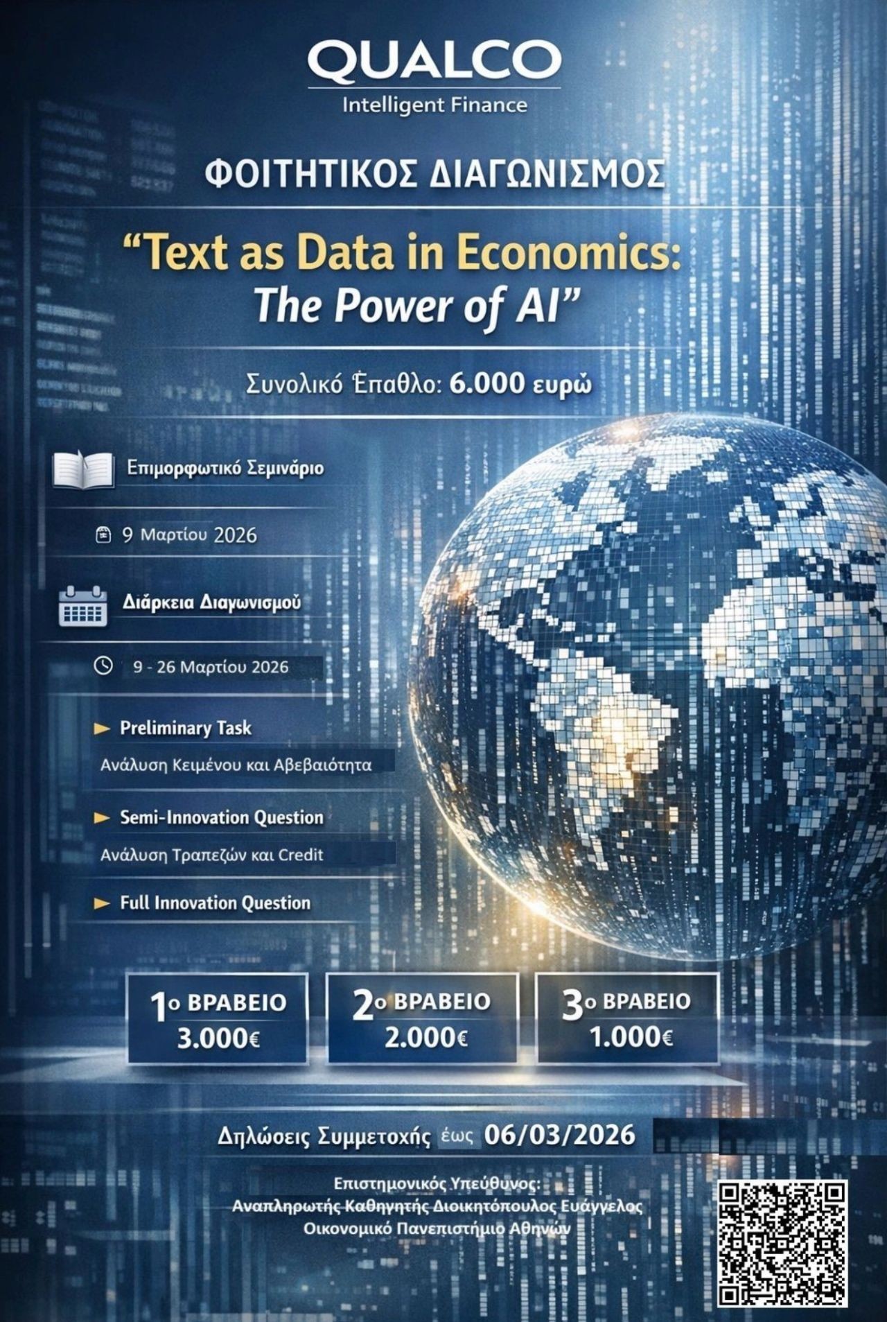 Ο Αναπληρωτής Καθηγητής και Διευθυντής του Εργαστηρίου Μελετών Οικονομικής Πολιτικής, Διοικητόπουλου Ευάγγελος σας προσκαλεί σε φοιτητικό διαγωνισμό με θέμα "Text as Data in Economics: The Power of AI" που θα πραγματοποιηθεί με την υποστήριξη, μέσω χορηγίας, της εταιρείας "Qualco Intelligent Finance".