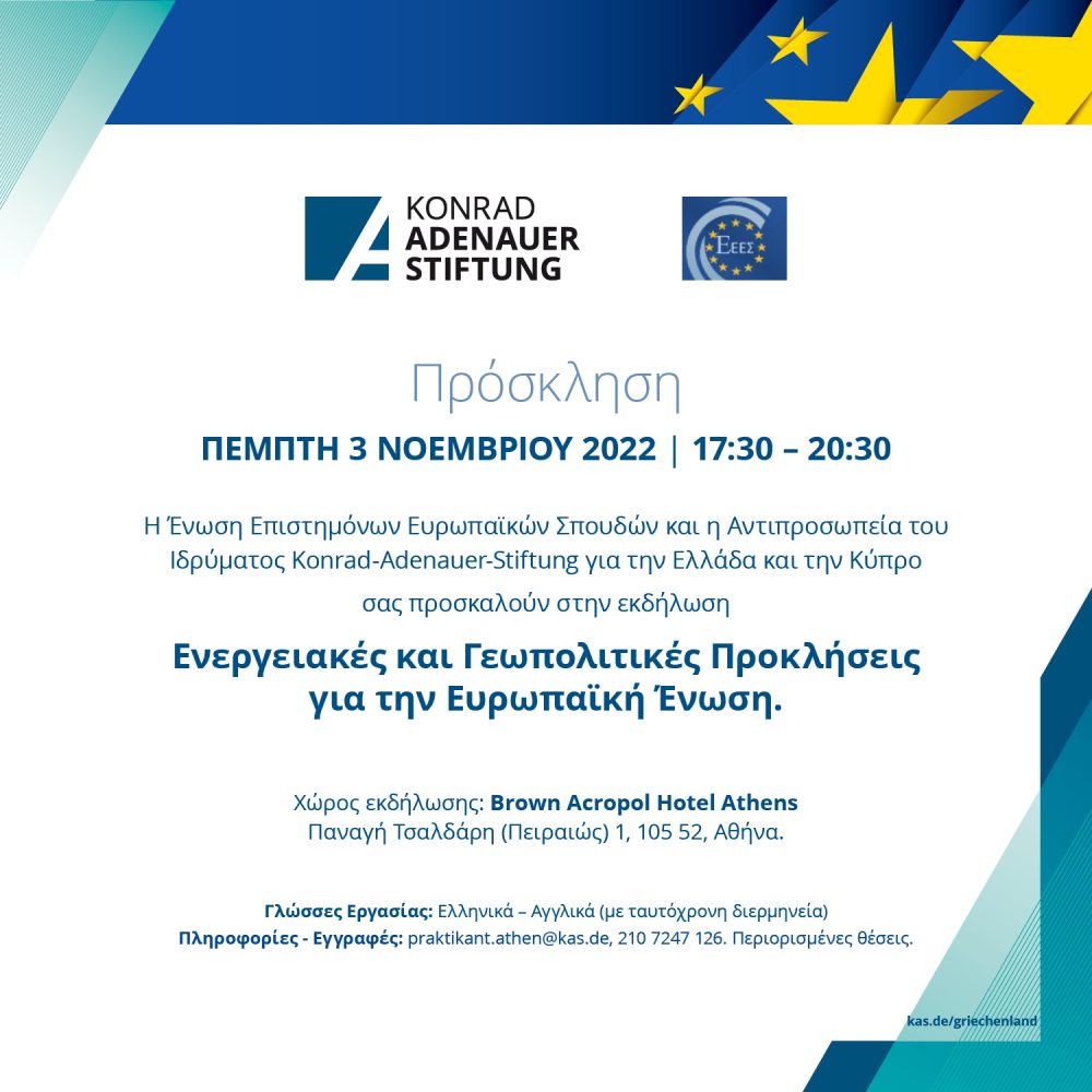 Την Πέμπτη, 3 Νοεμβρίου 2022, 17:30 – 20:30, η Ένωση Επιστημόνων Ευρωπαϊκών Σπουδών και η Αντιπροσωπεία του Ιδρύματος Konrad-Adenauer-Stiftung για την Ελλάδα και την Κύπρο διοργανώνουν επιστημονική εκδήλωση με θέμα: