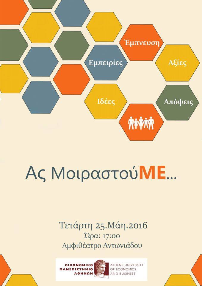 Οι φοιτητές του Τμήματος Μάρκετινγκ και Επικοινωνίας διοργανώνουν εκδήλωση με θέμα «Ας ΜοιραστούΜΕ....Ιδέες, Εμπειρίες, Γνώσεις, Αξίες» την Τετάρτη 25/5 και ώρα 17.00 στο φουαγιέ του Αμφιθεάτρου Αντωνιάδου στο ΟΠΑ. Στόχος της εκδήλωσης είναι η ενδυνάμωση της κοινότητας του τμήματος, το χτίσιμο σχέσεων και η ανταλλαγή εμπειριών και ιδεών μεταξύ όλων των μελών του (φοιτητών και ακαδημαϊκού - διδακτικού προσωπικού). Είμαστε όλοι εκεί! -