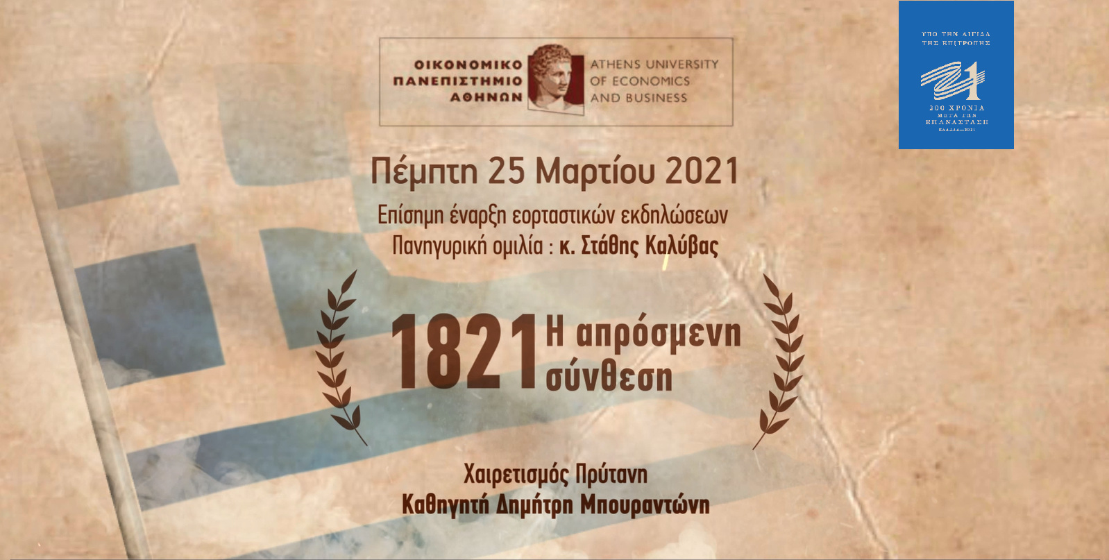 Την πανηγυρική ομιλία με τίτλο «1821: η απρόσμενη σύνθεση» θα εκφωνήσει ο κ. Στάθης Καλύβας, Καθηγητής Πολιτικής Επιστήμης, κάτοχος της έδρας Gladstone στο Πανεπιστήμιο της Οξφόρδης.