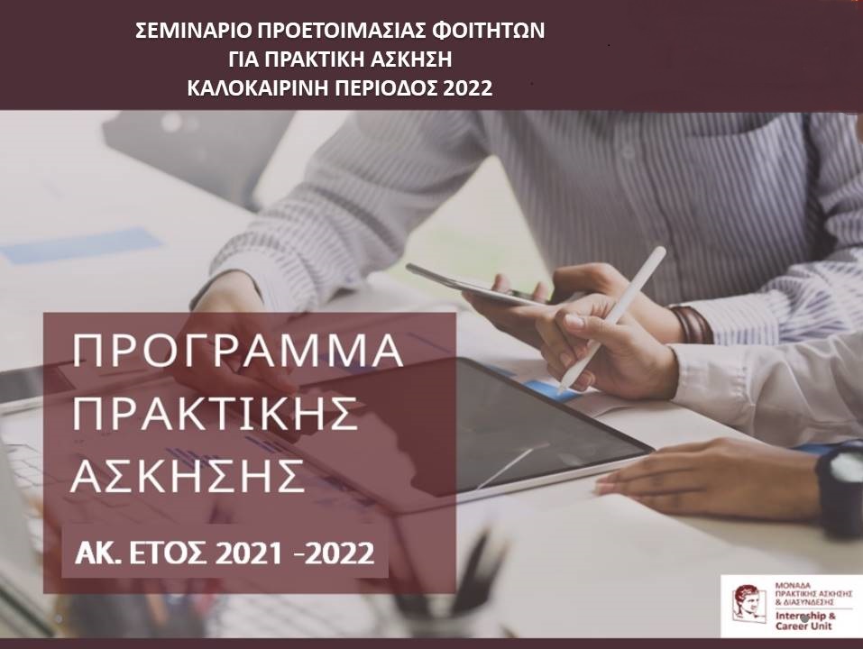 Στο πλαίσιο του Ιδιωτικού αυτοχρηματοδοτούμενου προγράμματος «ΠΡΑΚΤΙΚΗ ΑΣΚΗΣΗ ΦΟΙΤΗΤΩΝ ΟΠΑ 2016-2020» καλούνται οι ενδιαφερόμενοι/νες φοιτητές/τριες να δηλώσουν το ενδιαφέρον τους για Πρακτική Άσκηση για την Καλοκαιρινή Περίοδο 2022, υποβάλλοντας ηλεκτρονική αίτηση εκδήλωσης ενδιαφέροντος αποκλειστικά μέσω του Πληροφοριακού Συστήματος Δ.Α.Σ.Τ.Α. του Οικονομικού Πανεπιστημίου Αθηνών www.dasta-is.aueb.gr.
