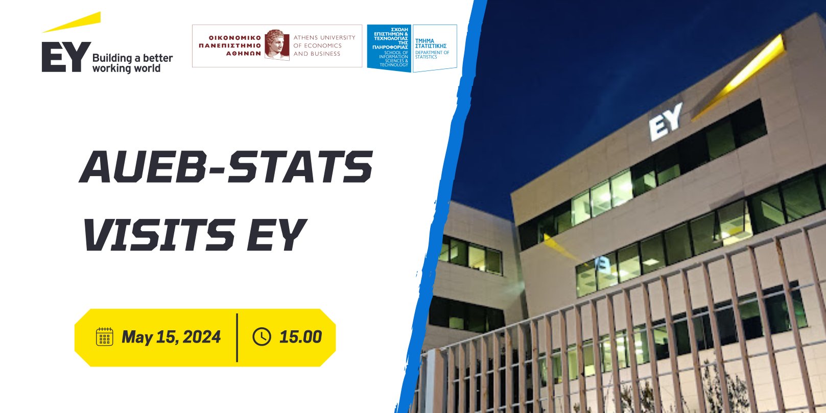 Στο πλαίσιο της συνεργασίας της Ernst and Young με το Οικονομικό Πανεπιστήμιο Αθηνών, διοργανώνεται εκπαιδευτική επίσκεψη των φοιτητών του Τμήματος Στατιστικής, στα γραφεία της EY (Χειμάρρας 8Β, Μαρούσι, χάρτης: https://maps.app.goo.gl/jP2QVEhTkRfQQemk8),
