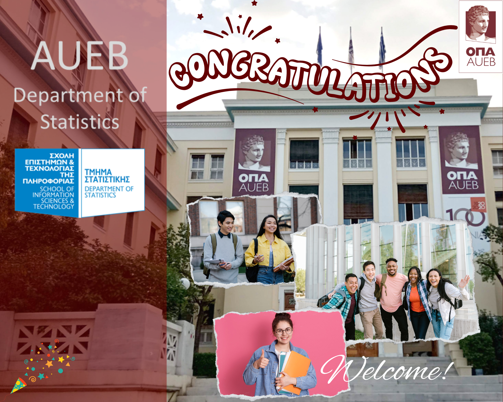 Το Τμήμα Στατιστικής, της Σχολής Επιστημών και Τεχνολογίας της Πληροφορίας, του Οικονομικού Πανεπιστημίου Αθηνών (ΟΠΑ) καλωσορίζει, με μεγάλη χαρά και υπερηφάνεια, τους νέους φοιτητές του!