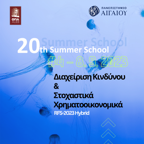 Τα Department of Statistics, Athens University of Economics and Business, Department of Business Administration | Athens University of Economics and Business, Tμήμα Λογιστικής & Χρηματοοικονομικής και το Εργαστήριο Στοχαστικής Μοντελοποίησης και Εφαρμογών του Οικονομικού Πανεπιστημίου Αθηνών, σε συνεργασία με τα Τμήματα Στατιστικής & Αναλογιστικών - Χρηματοοικονομικών Μαθηματικών και Μηχανικών Οικονομίας & Διοίκησης του University of the Aegean, συνδιοργανώνουν το 20ο Θερινό Σχολείο στη Διαχείριση Κινδύνου και τα Στοχαστικά Χρηματοοικονομικά, στις 4 - 8 Σεπτεμβρίου 2023.