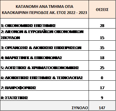 - Οι διαθέσιμες θέσεις πρακτικής άσκησης με χρηματοδότηση ΕΣΠΑ για την καλοκαιρινή περίοδο Ακ. Έτους 2022-2023 ανά τμήμα είναι: