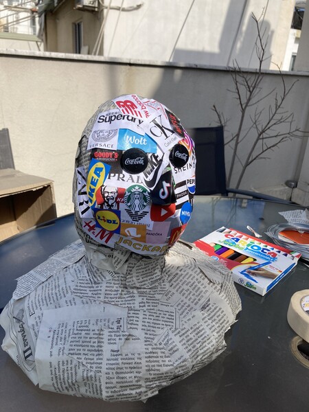 Πάνω στο πρόσωπο αυτής της μορφής κολλήσαμε τα λογότυπα διάφορων brands τα οποία καλύπτουν όλα τα χαρακτηριστικά του. Με αυτό θέλαμε να αναδείξουμε την εμμονή με τις μάρκες και την εξωτερική εμφάνιση που καταλήγει να καλύπτει την αυθεντική ταυτότητα του ατόμου και να δημιουργεί μια “μάσκα” ώστε να υπάρξει κοινωνική αποδοχή σύμφωνα με τα κοινωνικά πρότυπα που υπάρχουν ακόμα και αν δεν εκφράζουν πραγματικά το ίδιο το άτομο.