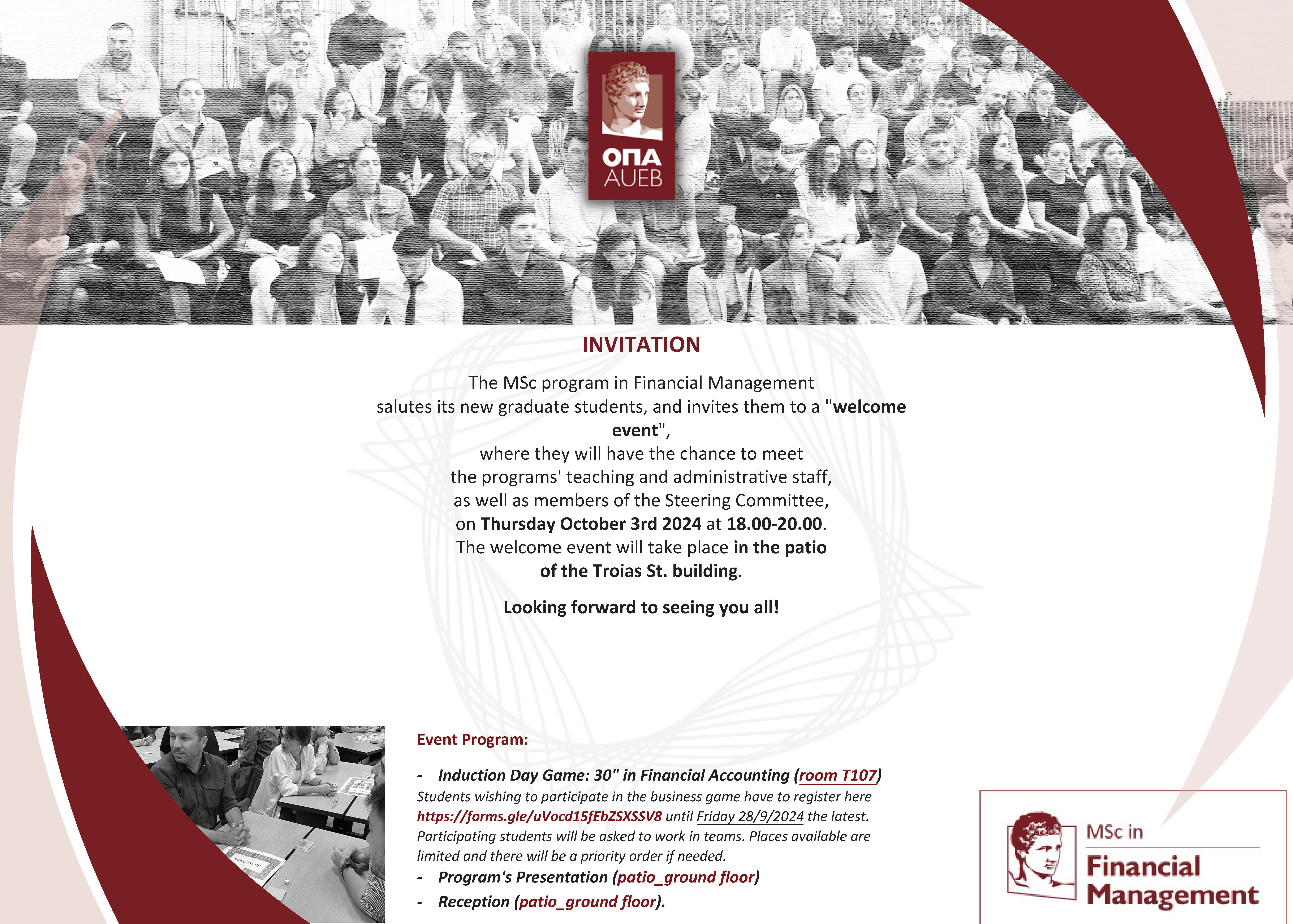 The MSc program in Financial Management salutes its new graduate students, and invites them to a "welcome event", where they will have the chance to meet the programs' teaching and administrative staff, as well as members of the Steering Committee, on Thursday October 3rd 2024 at 18.00-20.00.The welcome event will take place in the patio of the Troias St. building.