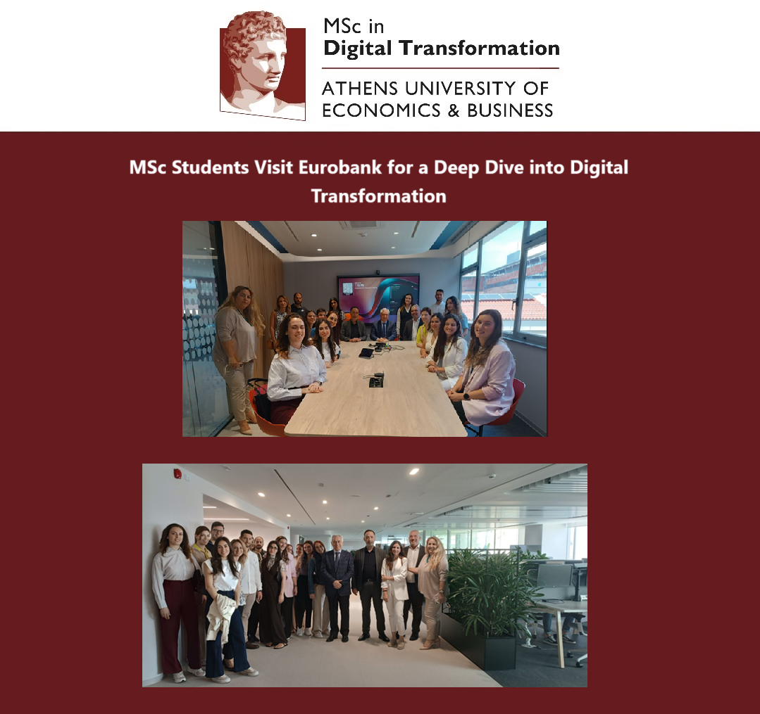 Professor George Lekakos, Director of the MSc Program, noted: “Eurobank is not only a sponsor of the Professional MSc in Digital Transformation, but also a best-practice example of leveraging technology—both in its internal operations and in the services it offers to its clients. We were particularly interested to hear about the bank’s digital transformation strategy and how coordination across teams improved after relocating under one roof in the Nea Ionia facilities. Eurobank’s experience in areas closely aligned with our program provides our students with valuable insights from the real market.”
