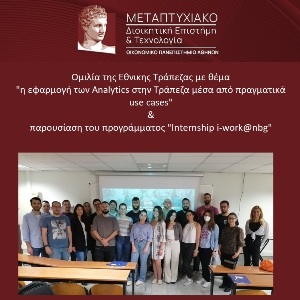 Στις 23 Μαΐου 2023 οι φοιτητές του ΠΜΣ παρακολούθησαν μια πολύ ενδιαφέρουσα εισήγηση από τα στελέχη της National Bank of Greece. Η κυρία Γεωργία Προκοπάκη, Επικεφαλής της Υποδιεύθυνσης Analytics Solutions & Campaign Management, έδειξε στους φοιτητές μας την εφαρμογή των Analytics στην Τράπεζα μέσα από πραγματικά use cases και η κυρία Μαριάνθη Αβραμίδου, Talent Acquisition & Development Professional παρουσίασε το Πρόγραμμα Internship i-work@nbg μέσω του οποίου οι φοιτητές μπορούν να κάνουν τα πρώτα βήματα στην καριέρα τους στην Εθνική Τράπεζα. Τις ευχαριστούμε για την παρουσία τους!