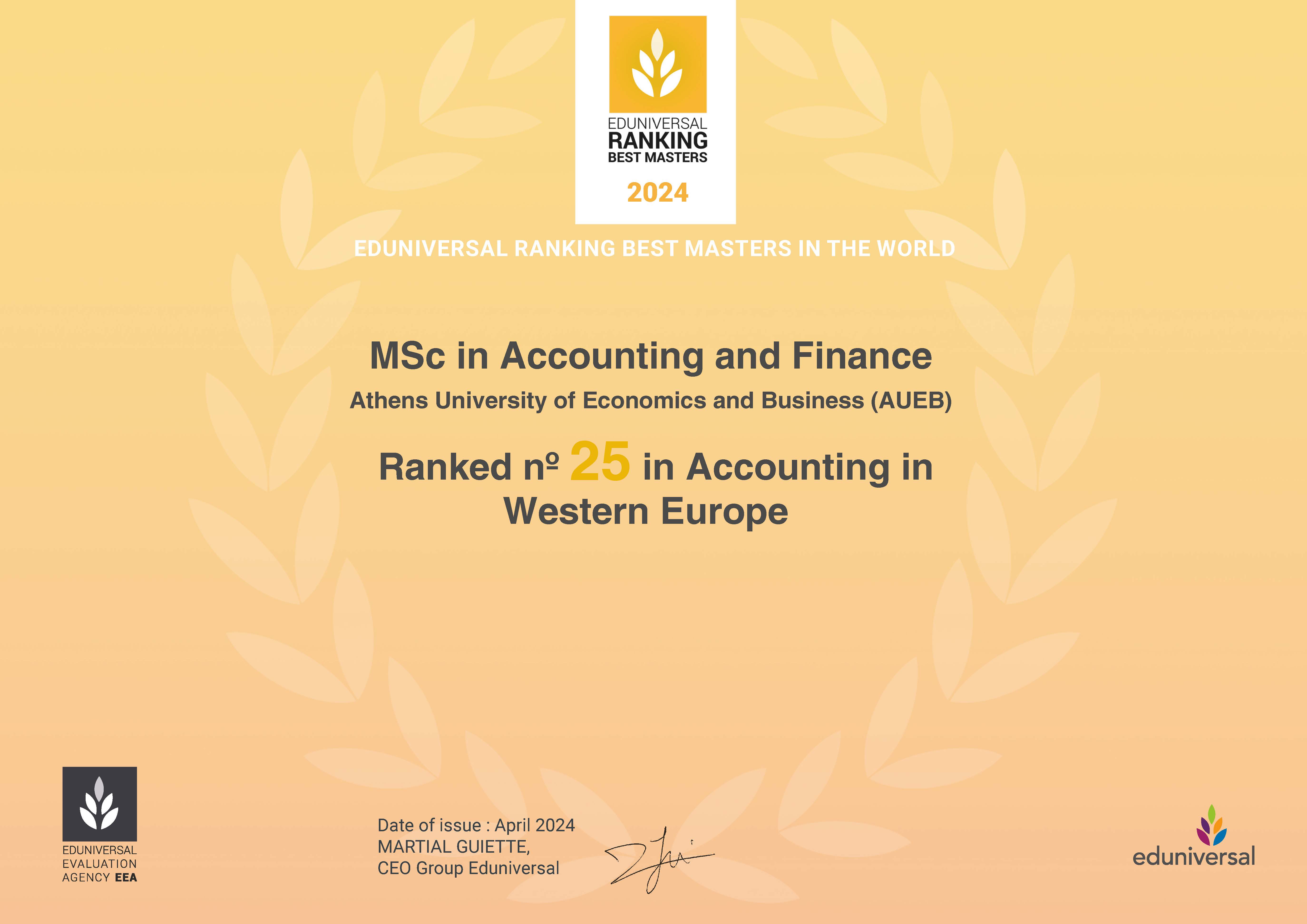 Το ΠΜΣ στη Λογιστική και Χρηματοοικονομική κατατάχτηκε 25ο στο subject "Accounting" στην ανταγωνιστική περιοχή της Δυτικής Ευρώπης σύμφωνα με τον φορέα αξιολόγησης πανεπιστημίων Eduniversal Best Masters Ranking 2024. Περισσότερες πληροφορίες EDUNIVERSAL BEST MASTERS & MBAs RANKING 2024 (best-masters.com).